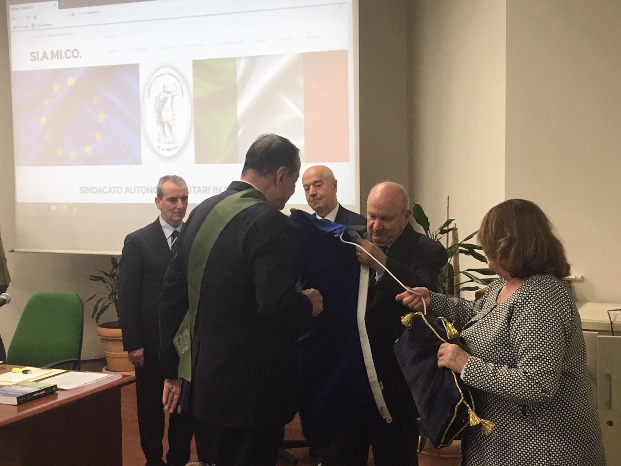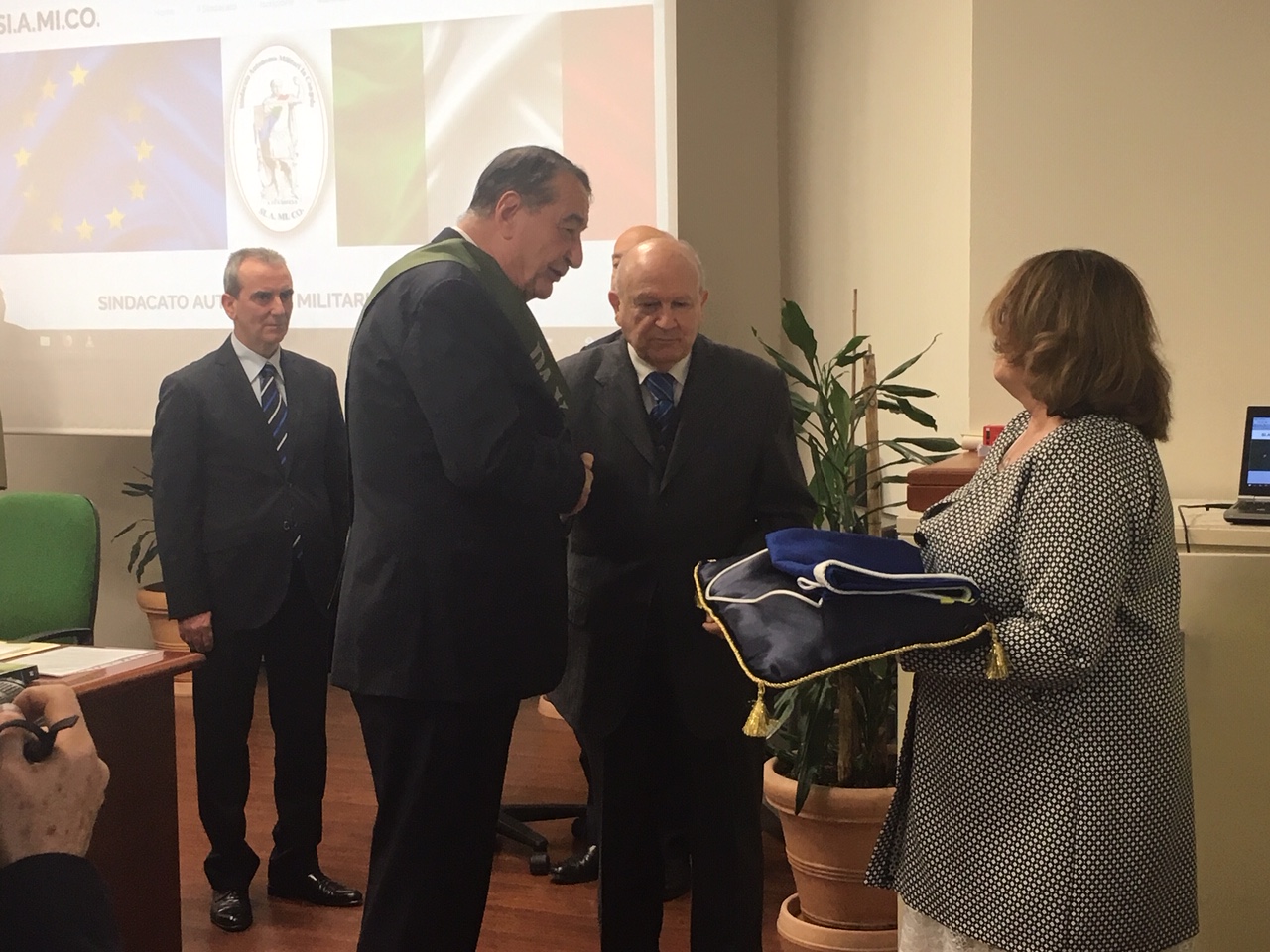 Alla presentazione sono intervenuti: il Generale Serafino Liberati, Segretario Generale del SI.A.MI.CO., l’Ingegner Giulio Cesari, Vice Segretario Generale del SI.A.MI.CO, il Dott. Dino De Gregorio, Presidente dell’Istituto di Integrazione Europea “Robert Schumann” e la Sig.ra Anna Fendi, ambasciatrice del Made in Italy nel mondo, in veste di madrina del SI.A.MI.CO. Nel corso della cerimonia il Dott. De Gregorio ha consegnato nelle mani del Gen. Liberati la bandiera del Parlamento Europeo unita ad un messaggio augurale del Presidente Antonio Tajani.